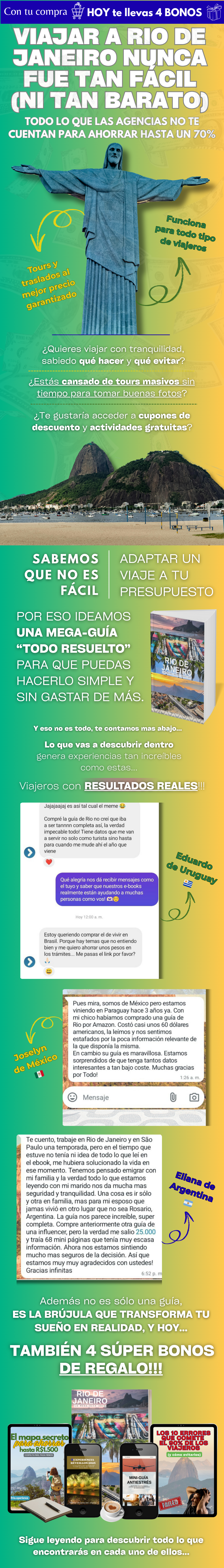 Virginia Cabrera 11-08-2025Compra VerificadaHolis! Volvimos de Rio el lunes pasado. Gracias por hacer una guía con DATA REAL y descuentos que de verdad sirven. Me hizo ahorrar plata y elegir bien sin que me vendan cualquier cosa, posta que tiene info q muy dificilmente te la cuenten, principalmente con los tours, hay mucho chanta suelto